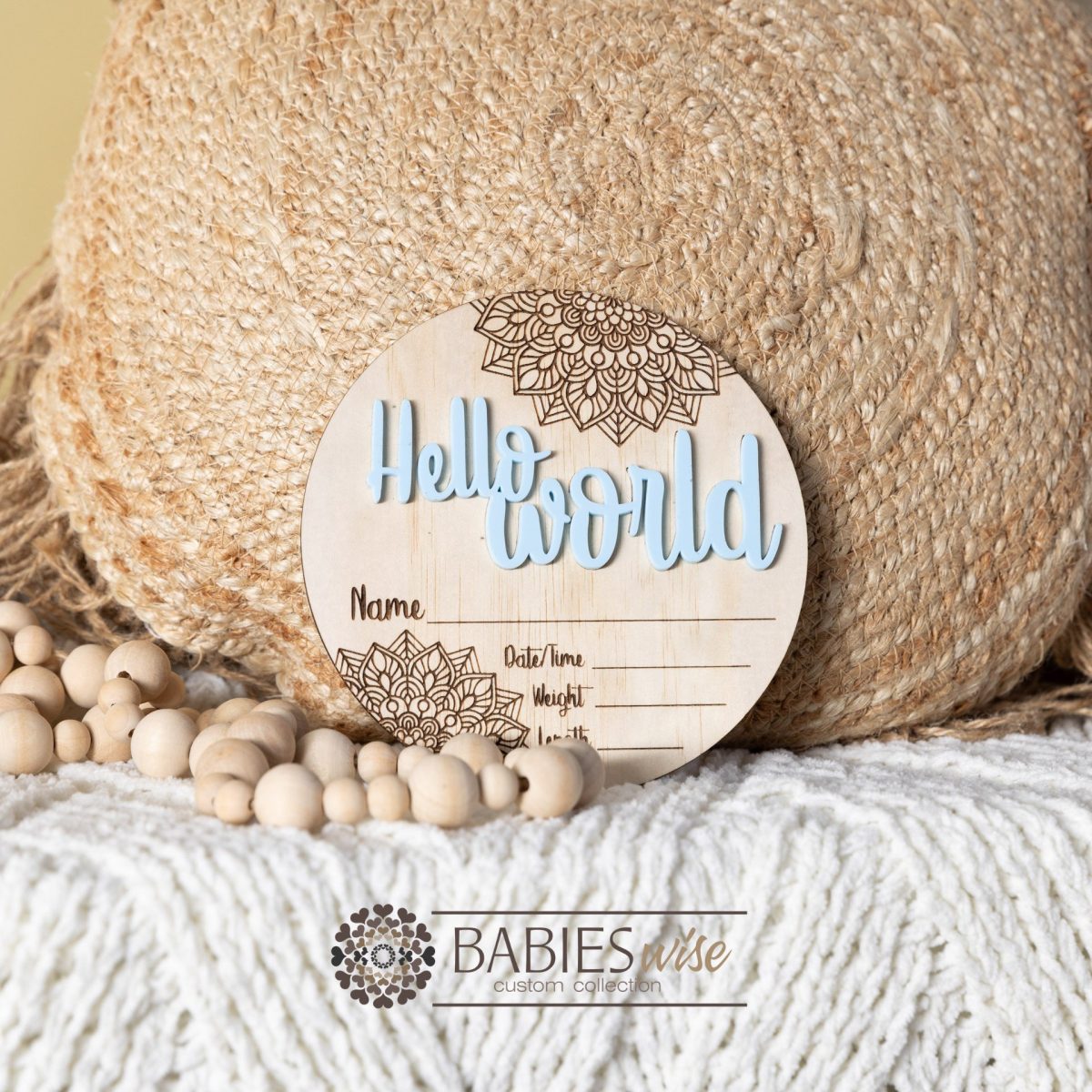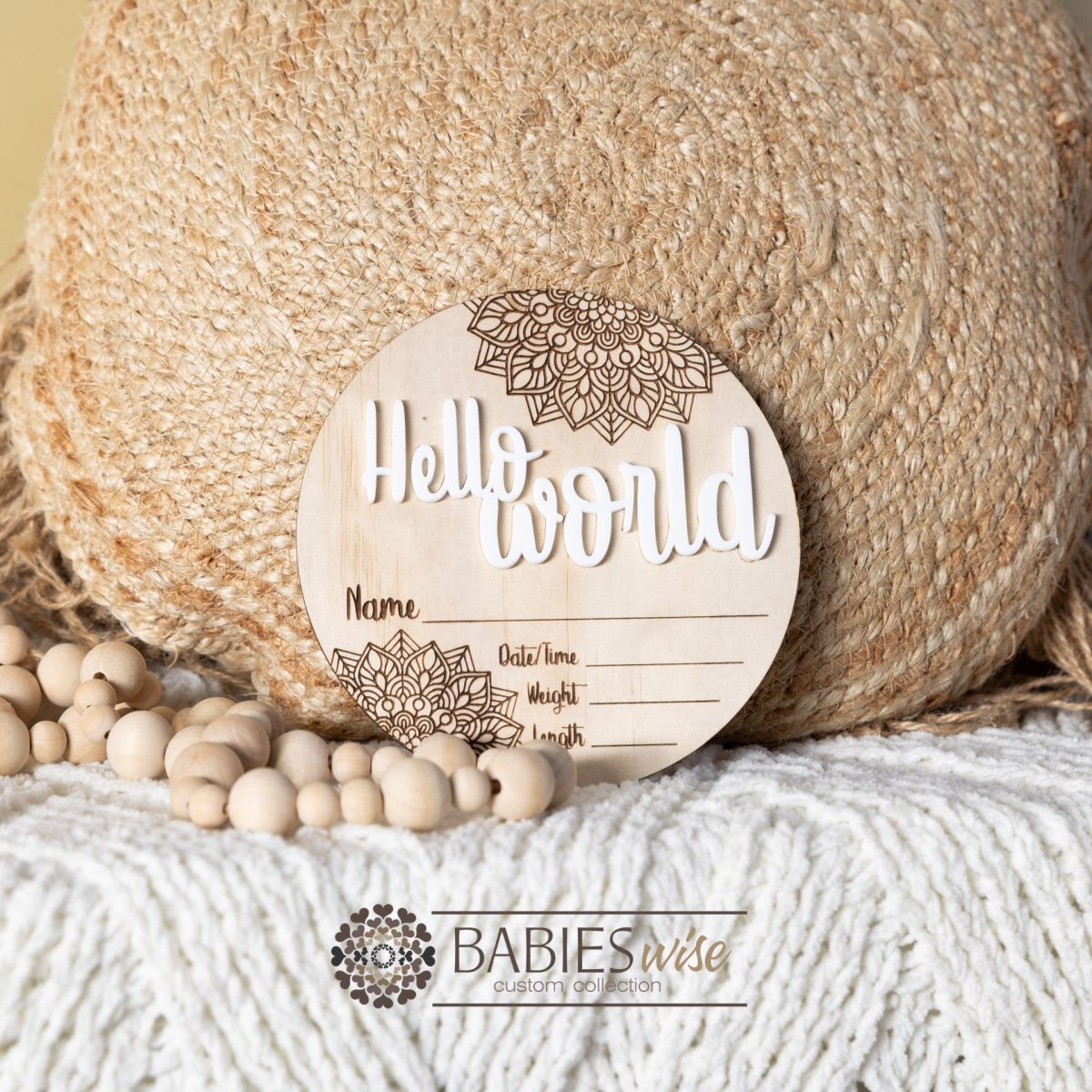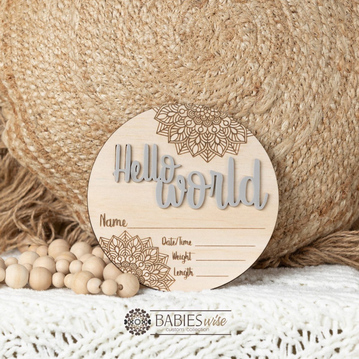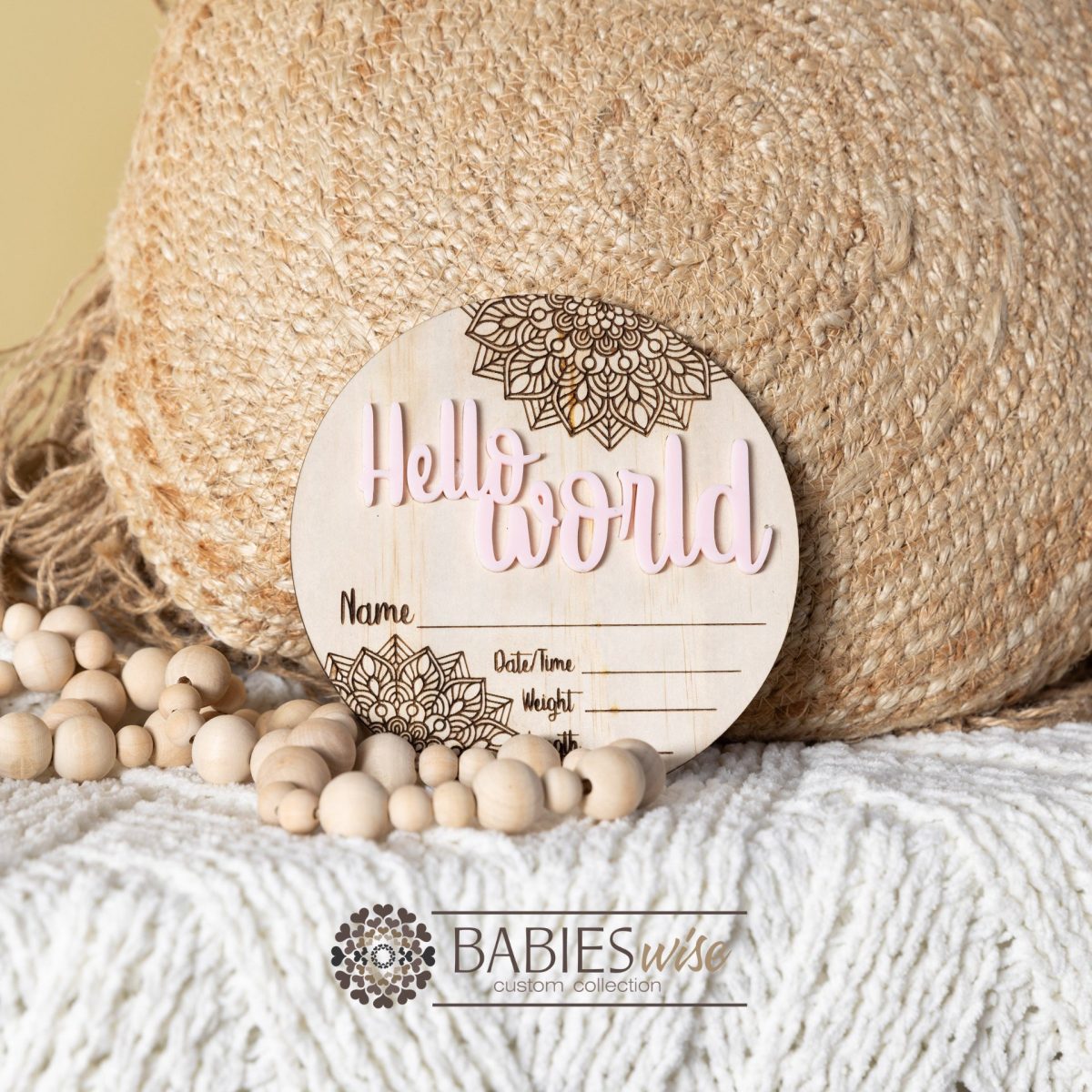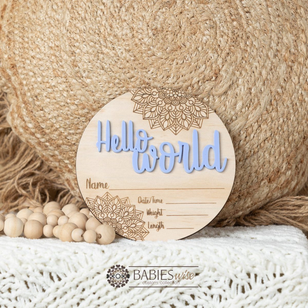 Announce your little one’s arrival in timeless style with our personalised birth announcement plaque, Timber Mandala 3D Acrylic Birth Announcement Plaque. A perfect keepsake for new parents, baby showers, or hospital photo announcements, this beautifully crafted timber disc features intricate mandala detailing and raised 3D acrylic wording reading “Hello World.” Record your baby’s precious details on our personalised birth announcement plaque – Name, Date, Time, Weight, and Length with the option to have them professionally etched or printed. Each piece is made with love from natural timber, making every plaque beautifully unique. Choose from a range of 3D acrylic colours, White, Black, Pink, Blue, Purple, Yellow, Coffee, or Mocha – to suit your nursery theme or announcement style. A heartfelt and elegant way to introduce your newest arrival to the world.