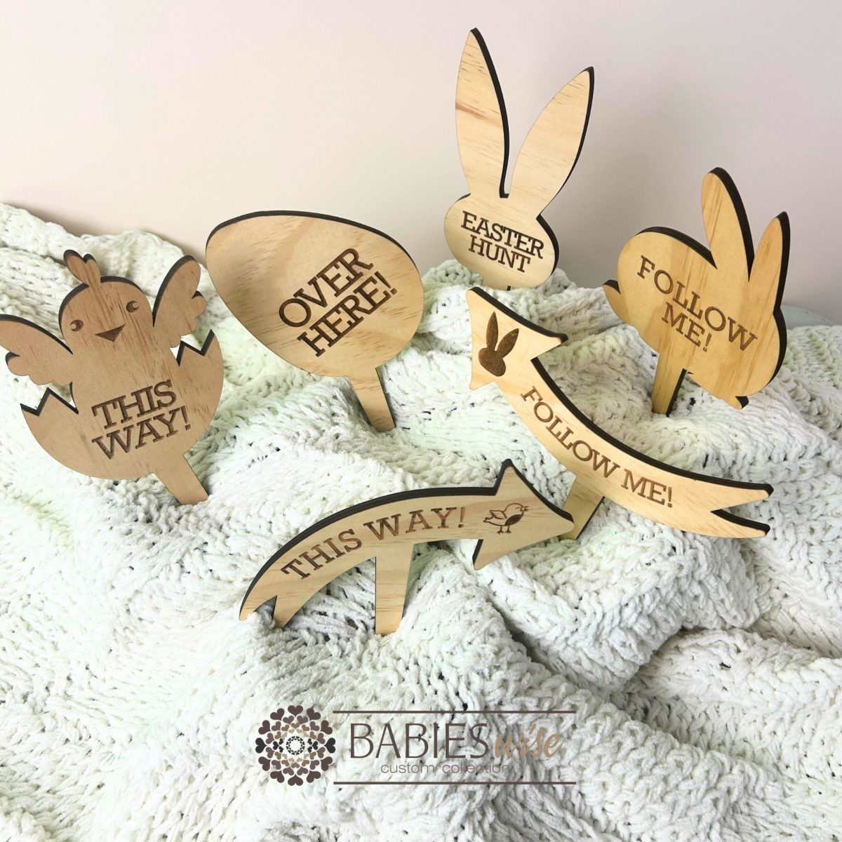 Create a magical Easter morning your children will remember forever with our “Garden Easter Egg Hunt Signs”- Set of 6. Designed to guide little adventures on their egg hunt journey, this charming set of timber spike signs add excitement, wonder and tradition to your Easter celebrations. Each sign features beautifully laser engraved wording, encouraging children to read the clues as they follow the trail towards their hidden treasure. Watch the joy unfold as your family moves from sign to sign. 1 x “Follow Me”, 2 x “This Way”, 1 x “Easter Hunt”, 1 x “Over Here”. Each piece is crafted from quality timber and laser engraved for timeless, natural finish. Simply place the spike signs into the lawn, garden beds or pots to create a fun and interactive Easter. More than just decorations, these Easter Hunt signs become part of your family tradition. Something that can be lovingly packed away and bought out each year after year, even handed down through generation. A beautiful way to create lasting Easter memories. Product Freatures: Set of 6 garden spike signs, Precision laser engraved details, Natural timber finish, Reusable year after year, perfect for gardens or indoor Easter Egg Hunts, designed and created by Babieswise.