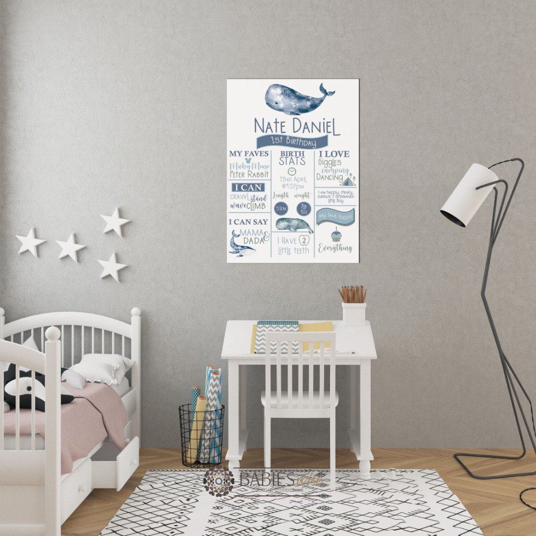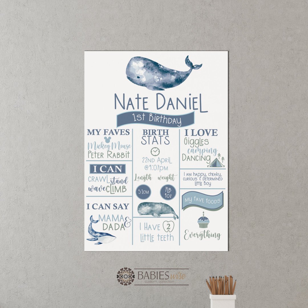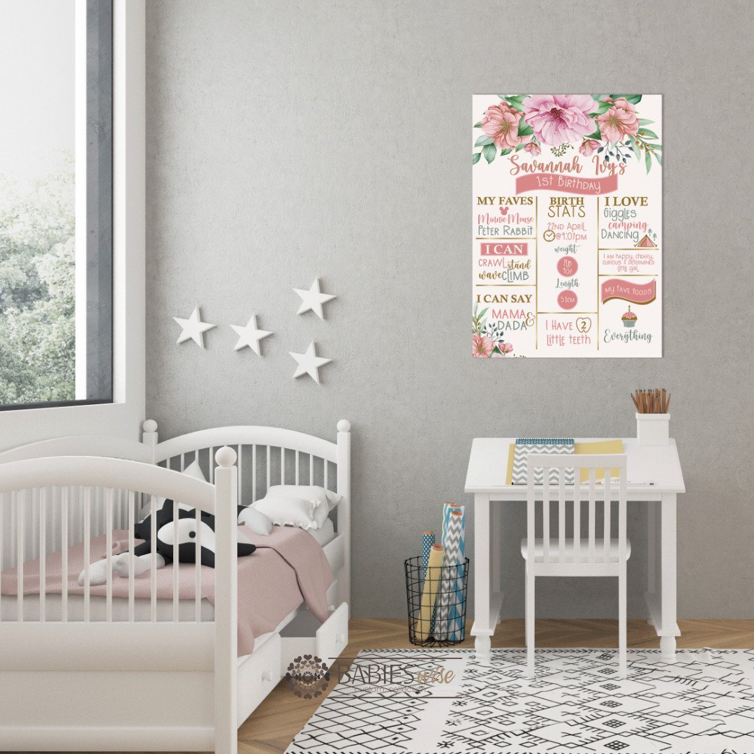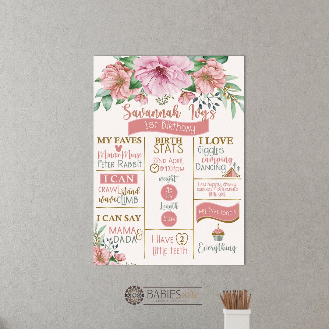 Celebrate your little one’s special milestones with our personlised “First Birthday Board”. This custom birthday milestone sign is the perfect way to showcase your child’s favourite things, achievements and memorable moments from their first year. Beautifully designed and personlised with your child’s name and details, this birthday board creates a stunning feature piece for birthday parties, cake smash photos and keepsakes memories.