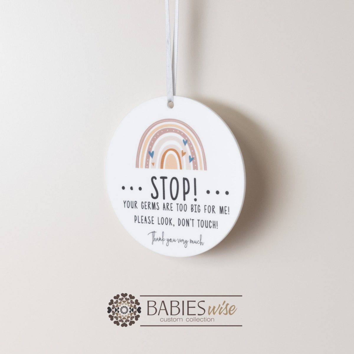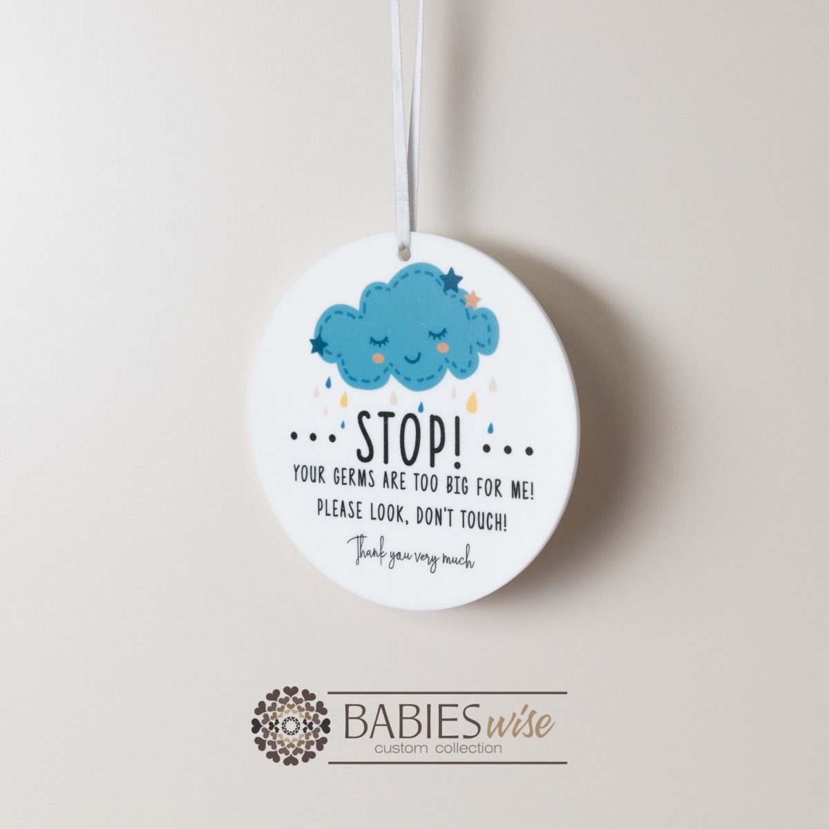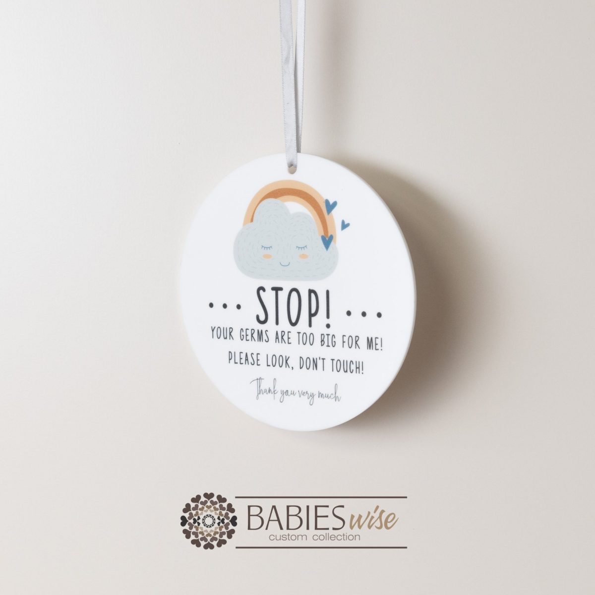 Help protect your little one with our sweet and gentle “STOP” Your germs are too Big for me” pram or cot sign from Babieswise. Designed as a friendly reminder for visitors, this adorable nursery plaque encourages people to pause before entering and to help keep your baby safe from unwanted germs. Perfect for newborns and young babies whose immune systems are still developing, this sign provides a polite way to remind guests to wash their hands, keep their distance or avoid touching your baby. Made from durable acrylic and beautifully UV Printed with soft nursery illustrations, each plaque features calming colours and charming designs including rainbows and clouds to complement your nursery decor. Simply hang the sign on your pram or nursery door handle. These plaques make a thoughtful “Baby Shower” gift for new parents wanting to create a safe environment for their newborn.