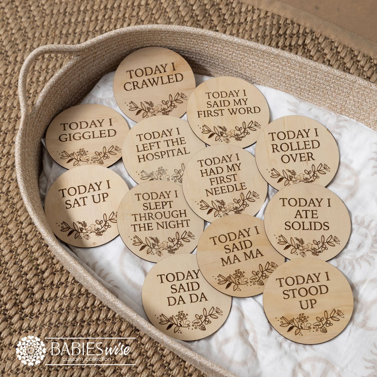 Capture the beautiful first moments of your baby’s journey with this engraved timber “Today I” milestone set from Babieswise. Thoughtfully designed and laser engraved on natural timber, these milestone discs help parents celebrate and remember the important developmental moments during their baby’s first year. Each disc marks a special milestone and can be used during photo moments to document your baby’s growth and achievements. These keepsake discs are perfect for creating meaningful memories to share with family and friends.